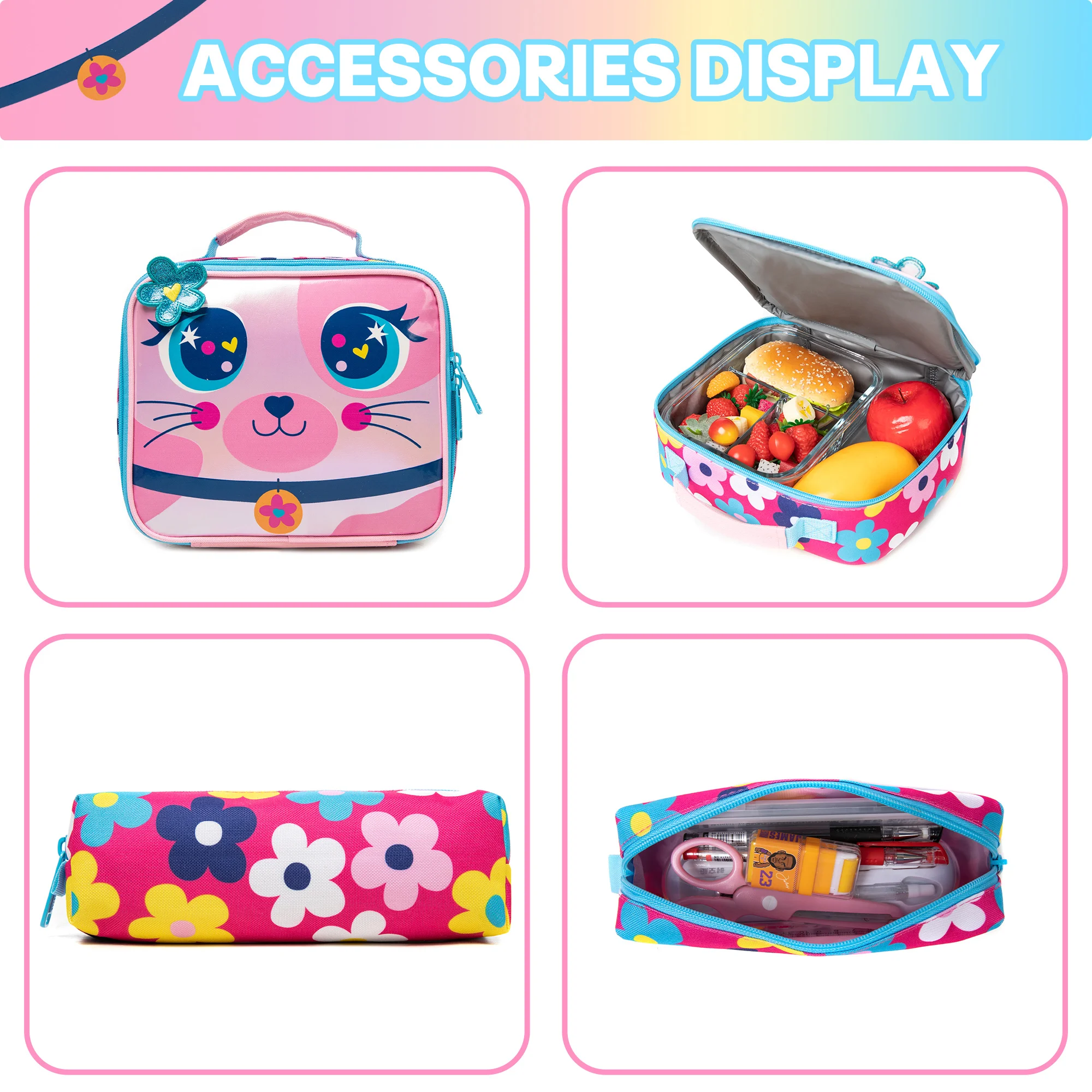 [Children's Backpack Size] Backpack: 16.5"x11.8.2"x6.7", Lunch Bag: 9.4"x8.3"x4", Pencil Case: 8.26". Includes a plush pendant. Versatile for children, it can be used to lighten the load on luggage, or as a backpack, or as a handbag with a handle on the top of the backpack.