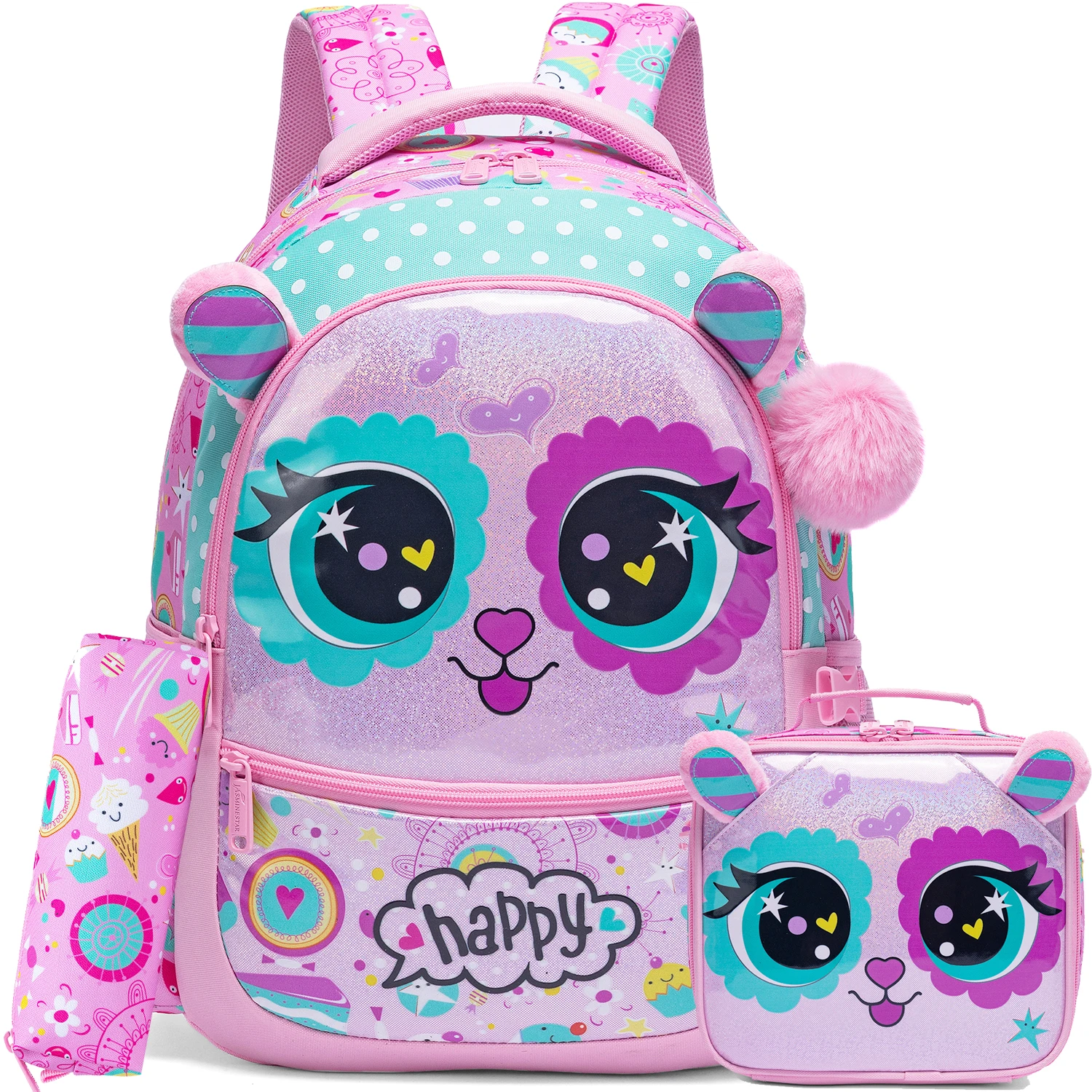 [Cute Cat Backapck Size]4 in 1 girls backpack,you will get 1 backpack,1 lunch box,1 pencil case and 1 pendant.★Backpack:17"X11.8"X6.7"Lunch Box:9.4"X7.8"X4"Pencil Case:9"