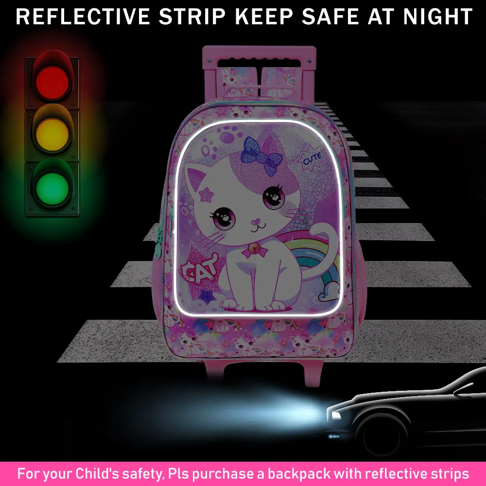 Girls Rolling Backapck 3 in 1 : Cute cat rolling backpack + lunch box+ pencil case, magic UV printing material, delicate polyester material, smooth zipper, widened and thickened shoulder straps make it feel nice and comfortable.