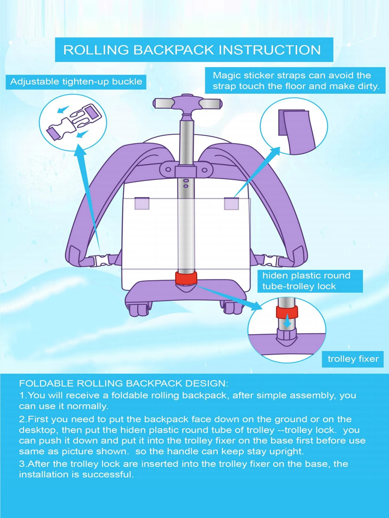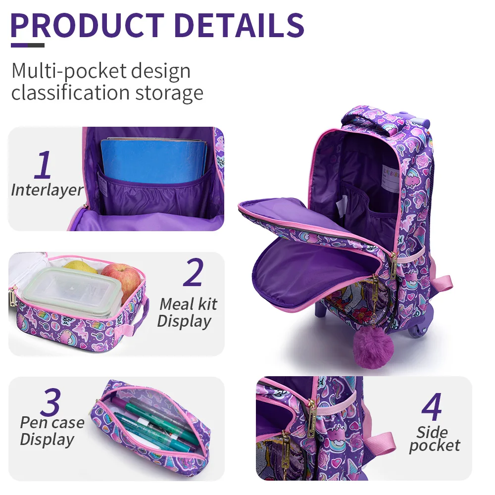 1. Girls Rolling Backpack : rolling backpack + lunch box+ pencil case, magic material, smooth zipper, widened and thickened shoulder straps make it feel nice and comfortable.